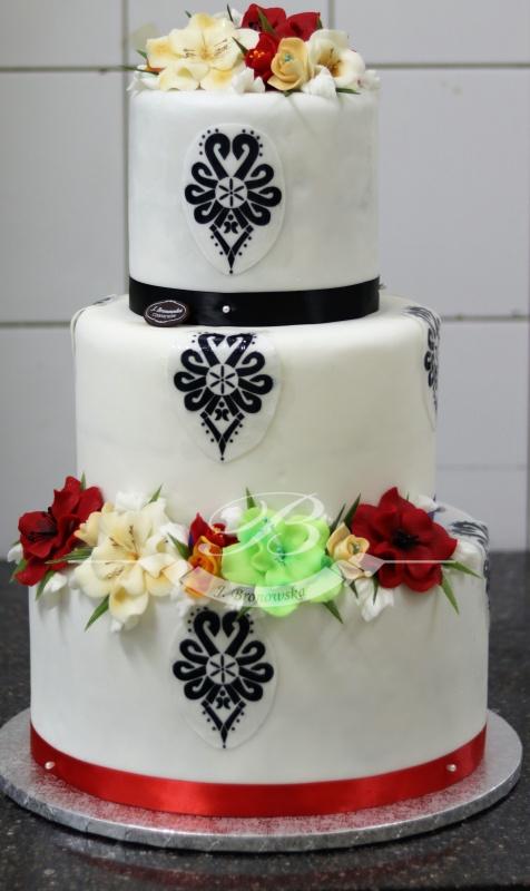 Tort z masy cukrowej. Waga od 6kg do 8kg. Kwiaty 29.00 zł/szt. Dekoracja dodatkowo płatna 70.00zł.